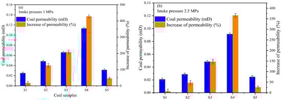 As shown in Figure 11, the permeability of coal samples treated with the mixed acid solution was remarkably larger than that of the original coal at the same inlet pressure. With the inlet pressure was 1 MPa, the permeability of coal samples rose by 17–428%. At an inlet pressure of 2.5 MPa, the permeability of the coal samples rose by 6.61–366%. Obviously, the incremental permeability of coal samples improved the ability of gas flow between coal seams, thereby improving the gas extraction efficiency.