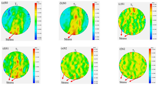 As shown in Figure 12, it is easy to quickly understand the differences in strain distribution by setting the strain in the form of percentage. The strain cloud maps of each group of coal samples show two different processes of change, with M0 (i.e., the original coal) strain change being more centralized and the centralized area expanding along the axial direction, while the internal strains of each mixed-acid-solution-treated coal sample showed discrete distributions upon stressing. This was because the coal samples treated with mixed acid solution became more porous, which made the strain dispersed. This is consistent with the results of the change in pore structure in Section 3.2.