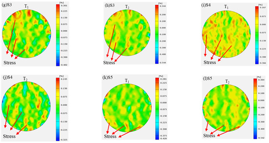 T1 is the strain cloud corresponding to the moment of initial stress on the specimen, and T2 is the strain cloud corresponding to the moment before the crack appeared in the coal sample.