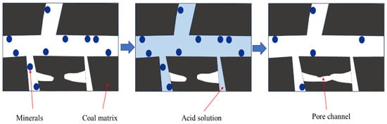 From Figure 14, it is clear that coal is a porous medium with many pore channels [47]. The pore channels are filled with small soluble components and organic minerals, resulting in poor connectivity between the pores [48]. After entering the pores, the acid solutions with different ratios firstly immersed and dissolved substances with larger molecules, which enlarged the fracture space of the coal body [49]. After treatment with different ratios of acid solutions, the fractal dimension D1 of coal decreased and the fractal dimension D2 showed an improvement in pore connectivity. At the same time, weakening of the mechanical properties of coal would reduce the fracture initiation pressure of hydraulic fracturing, promote the formation of multi-branched fracture networks, reduce the tortuosity of the gas diffusion path, and increase permeability [50,51,52].