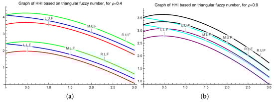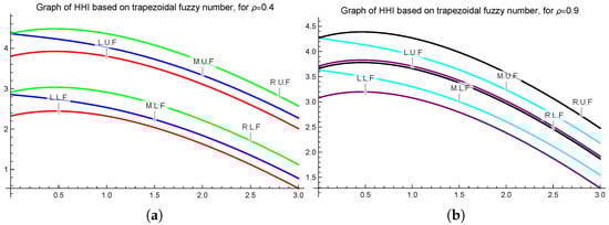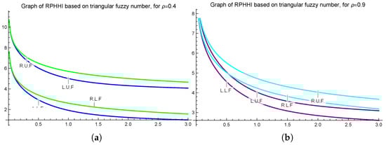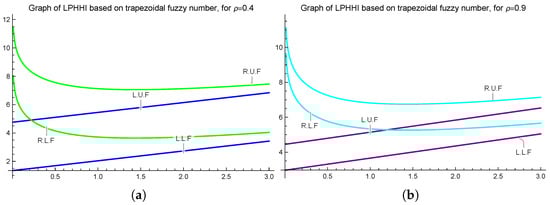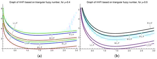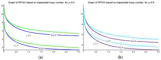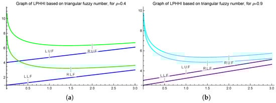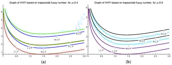 To construct Figure 9a,b, we consider the triangular fuzzy number-valued extended -ℏ convex mappings, and specific values ρ. Both figures affirm the accuracy of the inequality proved in Theorem 11.