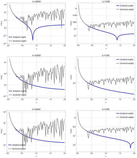 A comparative These images are automatically generated and do not support the mentioned modifications. analysis of the precision of analytical weights versus numerical weights is conducted for the test functions , , and , corresponding to the top, middle, and bottom positions, respectively. The figures on the left and right illustrate the approximation results for the 1st and 2nd derivatives, respectively.