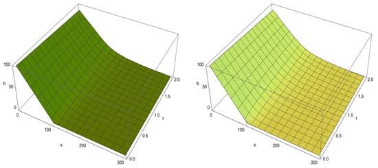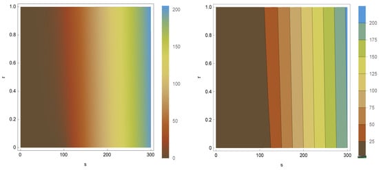 where denotes time until expiration, and the time differentiation is defined in terms of the right-sided modified Riemann–Liouville (RL) differentiation for . When (equivalently, ), Equation (3) simplifies to the classic BS PDE. The scalars and q represent a suitable parameter, and dividend yield, respectively.