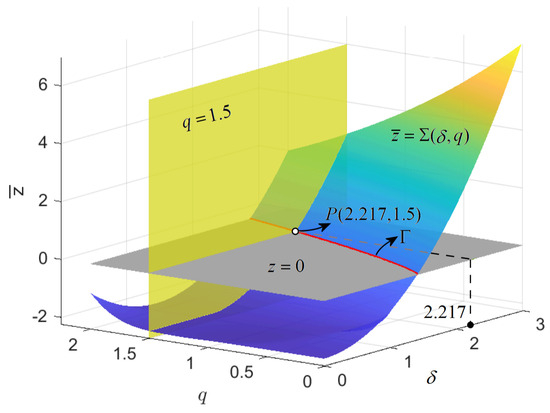 To determine the solutions graphically, denote the surface determined by the characteristic polynomial by , the surface being drawn in Figure 2. The intersection between and the plane , denoted by (red plot), represents the curve of solutions of the fractional characteristic equation. For example, for , the numerical solution of the characteristic Equation (24) is , which matches with the graphical solution; the intersection between the plane and (point in the plane ).