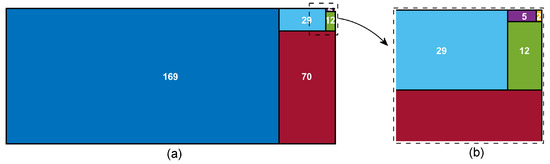 As known, a domino tiling with Pell’s numbers is a tessellation of some region by dominoes by using rectangular tiles. For example, the kth rectangular tile has the length and the width (see, e.g., [24,25]). In Figure 3 the case of domino tiling with 8 Pell’s numbers is presented (the zoomed rectangle reveals the tiling steps).