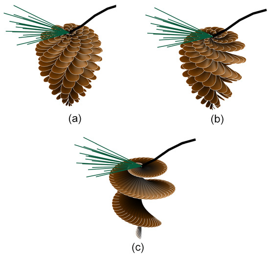 Artistic fractional pinecone obtained with the script [26] for (a) IO silver ratio, ; (b) fractional silver ratio, , corresponding to ; (c) fractional silver ratio, , corresponding to .