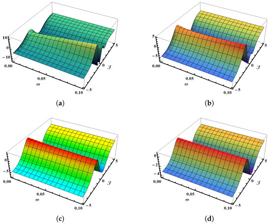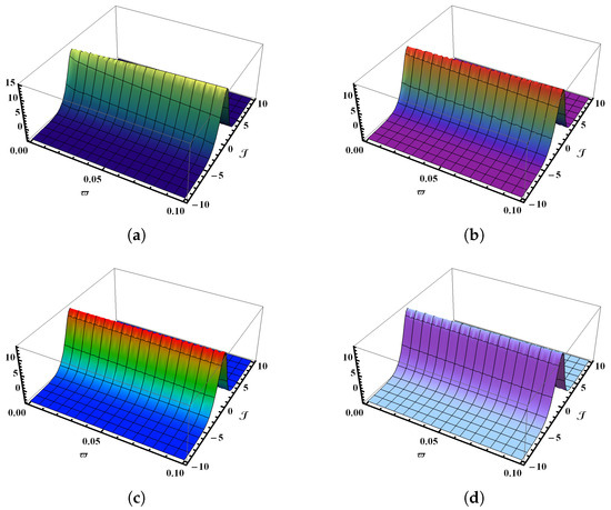 Figure 1a presents the 3D graphical representation generated from the numerical results of the SHTM for the time-fractional K-S model at . In contrast, Figure 1b illustrates the corresponding physical behavior at . Similarly, Figure 1c displays the output of the K-S problem at , while Figure 1d captures the profile of the precise outcome within the domain and for the K-S problem (Section 5.1). The graphical results demonstrate that as the fractional value of increases, the outcome increasingly converges with the precise 3D model. Figure 2a,b provide a visual comparison of over the interval , showcasing the outcomes for (solid red line), (solid blue line), (solid green line), and (dashed line). Figure 3a,b provide a visual comparison of over the interval , showcasing the outcomes for (solid red line), (solid blue line), (solid green line), and (dashed line) with and , respectively. Figure 4a illustrates the contrast between the SHTM findings and the exact outcomes over the interval when and , whereas Figure 4b offers the relationship across the SHTM and the precise outcomes over the interval when and . It is evident that the SHTM solution at shows excellent accuracy to the precise outcomes that confirm the reliability of the proposed method. Moreover, the solution becomes increasingly precise as the fractional-order value approaches unity.