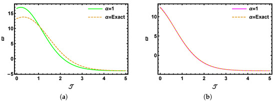 Graphs of 2D visual comparison between SHTM results and the precise outcomes for with multiple fractional values of when with (a) and (b) .