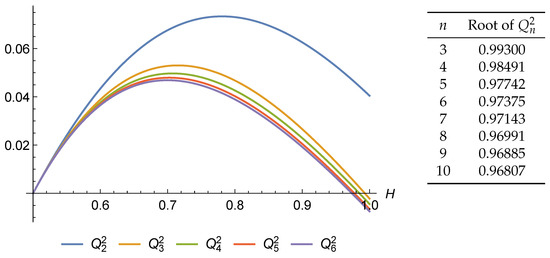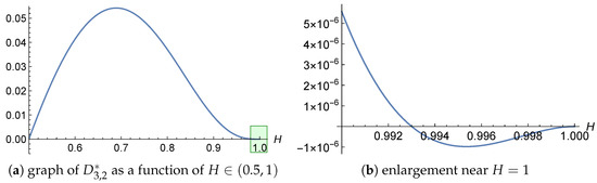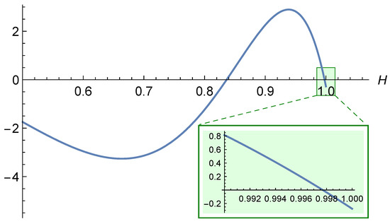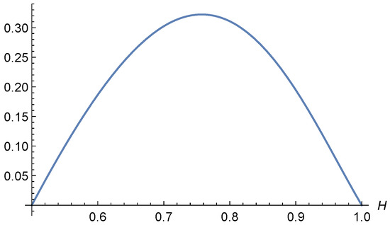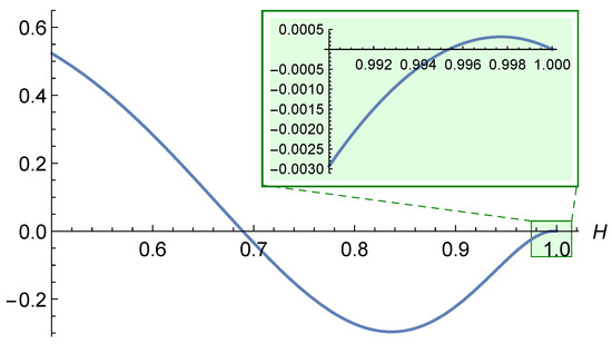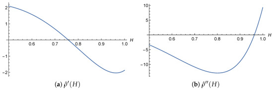 It would be sufficient to show that the second derivative is negative; however, this is not the case, as illustrated in Figure 2. Notably, the second derivative becomes positive for . This observation provides further evidence that the analytical investigation of becomes increasingly challenging for large values of H.
