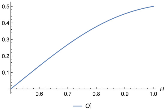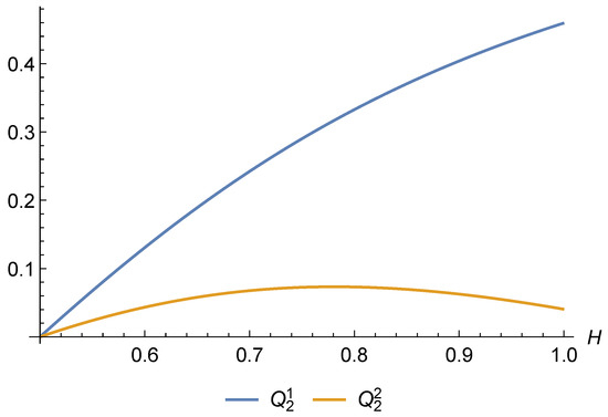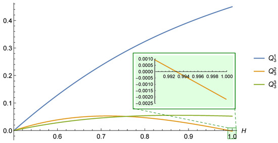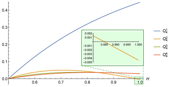 For the cases and , we provide the graphs in Figure 10 and Figure 11. In both cases, all coefficients except the second ones (i.e., and ) are positive for all . The second coefficients become negative as H approaches 1.