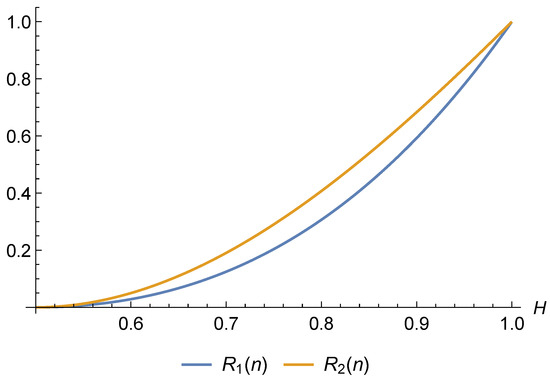 These subsequent increments , , create a process that is named fractional Gaussian noise (fGn). The main properties of this relatively simple discrete-time Gaussian process are stationarity and the presence of what we call memory. The length of memory is infinite; however, its intensity depends on Hurst index H, which in turn should be the object of statistical estimation. For the properties of fGn and statistical estimation, see, e.g., [1,2,3,4,5,6,7,8,9] (of course, any list of references is not exhaustive). These properties have made fractional Gaussian noise extremely popular in applications, in particular, to physics [10,11], hydrology [12], information theory [13], signal detection [14], related permutation entropy [15,16], and many other fields. Additionally, fGn serves as a model for chain polymers exhibiting long-range interactions among monomers along the chain, see, e.g., [17].