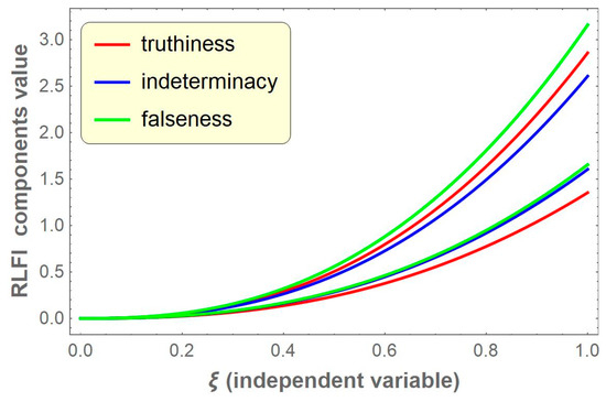 The six components of RL fractional integrals of the neutrosophic function are presented graphically in Figure 1 for particular fractional order and , , and with respect to independent variable . The region between red curves represents the truthiness area of the RLFI value, and, similarly, the region between the blue curves and green curves represents the indeterminacy and falseness area of RLFI value, respectively. For any given , all six components are clearly visible in the figure.