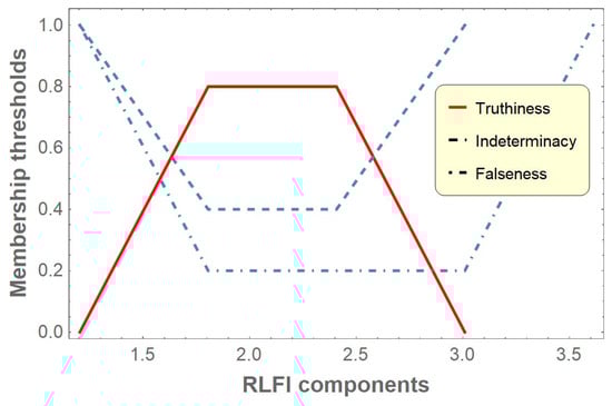 Table 2 includes the different components of RLFI of the neutrosophic-valued function at fractional integration order and for different values of membership thresholds , , and . When the value of truth membership threshold increases, the value of increases but decreases. Again, when the value of indeterminacy threshold increases, the value of decreases but increases, and the same occurs for the falseness membership threshold . These components are presented graphically in Figure 2. Figure 2 illustrates that the RL fractional integration of is also a trapezoidal neutrosophic number.