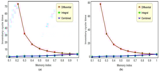 The concept of “memory” holds significant importance across a wide range of situations, including those involving physical phenomena and the processes involved in making decisions. The choices made by managers concerning demand forecasting, price setting, and purchasing trends, along with customer emotions, are inevitably shaped by the accumulated experiences of those crafting the strategies. A mathematical model can be highly beneficial when examining physical events by utilizing a variety of mathematical techniques, allowing for a comprehensive understanding that closely approximates real-world situations and happenings. In this situation, the theoretical framework of fractional calculus (FC) emerged as a highly suitable and effective approach of said situation [,]. In ordinary derivatives, which measure how a function changes over time using integer orders, there is no mechanism to incorporate memory or retain information about past states. Consequently, ordinary calculus does not capture dynamic memory effects and is limited in its ability to reflect a system’s complete historical behavior. By contrast, the fractional derivative (FD) considers the rate of change as being shaped by all points across a given time span, with the fractional order serving as an indicator of the system’s memory retention [,,,]. It can take into account the past data leading up to the current moment or project forward from the present into future scenarios []. Numerous scholars [,] have demonstrated profound investigations into memory processes by employing the mathematical relationships inherent in FC. To demonstrate the memory effect within the context of an inventory control, the researchers propose that the rate of inventory level is expressed as a fractional value []. In this framework, the specific order of the FD serves as an indicator of the memory influence, and this type of derivative is called memory-dependent derivatives []. As the fractional order drops, it indicates stronger memory effects on the system. The system becomes less memory dependent as the fractional order nears one. Various studies on memory effect criteria in fractional-order derivatives or integrals have emerged in inventory control theory.