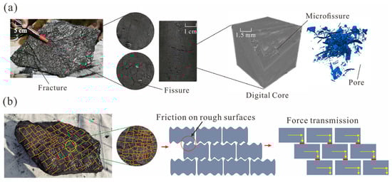Hierarchical structure of coal: (a) schematic diagram of the multistage structure of coal; and (b) coal matrix crosslinked by rough surfaces.