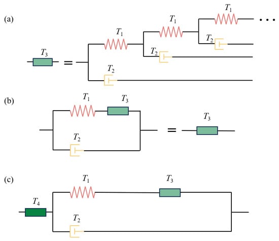 Figure 2a shows the simplified model of the fractal cell in the self-similar viscoelastic model of coal. Figure 2b presents the mechanical representation of the infinite-level self-similar viscoelastic model, while Figure 2c gives the simplified model of the binary structural element of coal proposed in this study. The operators of equivalent elements for such binary-classification structures can be expressed as follows []: