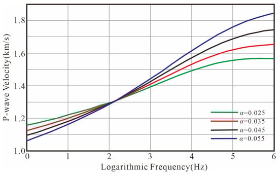 Figure 5 and Figure 6 show the influence of the fractional order on dispersion and attenuation. originates from the fluid–solid coupling effect of mesoscopic pores. It has little effect on the longitudinal wave velocity in the low-frequency part. The influence of on the longitudinal wave velocity gradually becomes apparent as the frequency increases. The influence of on attenuation is less significant at low frequencies than at high frequencies. Moreover, the larger the value of , the faster the decrease in the attenuation rate at high frequencies.