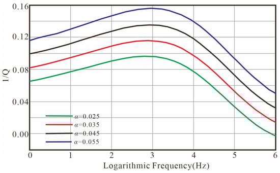 Dispersion refers to the change in the propagation speed of a wave as the frequency changes. As can be seen from Figure 3, within the frequency range of 1 to 106 Hz, the difference in the variation of the longitudinal wave velocity in the curve increases with the increase in . Therefore, the conclusion can be drawn that dispersion is positively correlated with . By observing Figure 4, it can be seen that when the frequency is fixed, as increases, the attenuation coefficient curve is almost shifted upward; that is, the attenuation coefficient becomes larger. Therefore, the attenuation coefficient is also positively correlated with . It is worth noting that the attenuation curve under the binary-classification model is not a normal distribution. Before reaching the characteristic frequency, the increase in attenuation is relatively slow; after the characteristic frequency, the attenuation will decrease suddenly. The fractional order reflects the viscoelastic friction of the macroscopic bedding and cleat system of the coal mass; its magnitude is closely related to the macroscopic fracture density. The attenuation curve shows an overall change with the value of , which verifies its macroscopic-scale property.