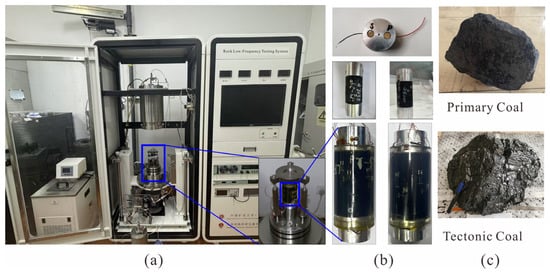 Experimental equipment and sample schematic diagram: (a) low-frequency test system of rock fracture; (b) low-frequency sample preparation process; and (c) raw samples of primary and tectonic coal.