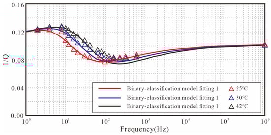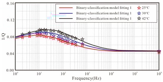 Figure 12 and Figure 13 are the attenuation fittings of primary coal and tectonic coal under different temperature conditions when saturated ~60% water. In the range of 10–100 Hz, the attenuation of both increases with the increase in temperature. It can be seen that temperature mainly affects the attenuation of the middle-frequency band. Within 10 Hz, the effect of temperature on attenuation is very weak. Table 5 is the fitting parameter of the model. The difference of fractional order under different temperature conditions is small, indicating that the influence of temperature on attenuation is significantly smaller than that of the confining pressure. The increase in temperature led to the decrease in relaxation time and the shift of the attenuation peak to a high frequency. However, the increase in temperature did not change the selection of fractional order and .