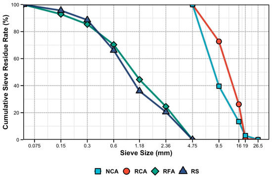 Particle size distribution curve. Note: NCA—natural coarse aggregate, RCA—recycled coarse aggregate, RFA—recycled fine aggregate, RS—river sand.