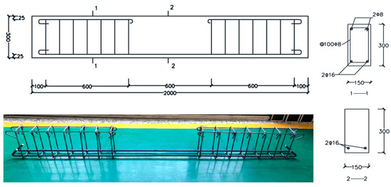 The beam dimensions were standardized at 2000 mm (length) × 300 mm (width) × 150 mm (depth), with a concrete cover thickness of 25 mm. For longitudinal reinforcement, 16 mm diameter HRB400 hot-rolled ribbed bars were employed. HPB300 plain round bars with an 8 mm diameter were selected for stirrups and structural reinforcement, resulting in an overall reinforcement ratio of 1.03%. To eliminate the influence of shear forces transmitted from supports on crack development in the flexural zone of recycled aggregate concrete beams, a 600 mm pure bending segment was implemented at the beam mid-span. This configuration ensured that the critical flexural section experienced a pure bending moment without shear interference. Stirrups and structural reinforcement were strategically placed in the adjacent flexural shear zones to prevent premature shear failure. The reinforcement details are illustrated in Figure 2 for visual reference.