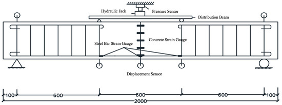 Figure 3 illustrates the schematic diagram of the loading device. It features a simply supported beam with a trisection loading arrangement, comprising pinned support at the left extremity and roller support at the right extremity, each offset 100 mm from the beam ends. Load application was facilitated through a distribution beam with a 600 mm spacing between loading points, connected to a hydraulic jack and a 60-ton load cell positioned concentric to the distribution beam’s geometric center. A comprehensive instrumentation suite was employed, including linear variable differential transformers (LVDTs) for displacement measurement—two units above each support assembly for settlement tracking and three units at mid-span for deflection profiling—alongside a DH3816 static strain analysis system for real-time strain acquisition from steel reinforcement and concrete matrix.