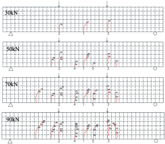 As a preparatory measure prior to mechanical testing, the lateral surfaces of all beam specimens underwent systematic grid pattern delineation to establish a reference framework for subsequent fractographic analysis. During the experimental bending protocol, crack propagation patterns were documented through sequential marker tracing synchronized with continuous high-resolution video recording. This dual-modality approach enabled the comprehensive capture of temporal and spatial crack evolution dynamics. Post-testing, digital fractographic reconstruction was performed. Within these digital representations, red colorimetric encoding was specifically implemented to enhance crack visibility and facilitate quantitative analysis. Herein, it focuses on the progressive crack development observed in the beam specimen RFA50 across the applied load spectrum. A representative fractographic progression is graphically depicted in Figure 4, illustrating the characteristic crack morphology evolution under incremental loading conditions.