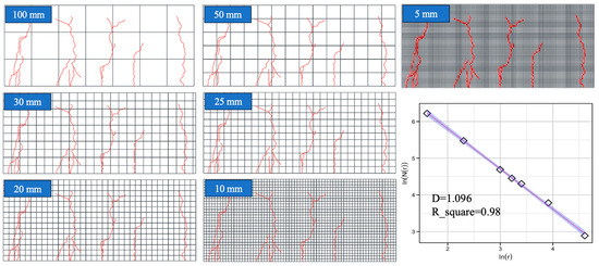 To investigate the correlation between crack morphology complexity and structural flexural resistance, the experimental protocol focused on the pure bending regions of beam specimens—the primary zone for flexural crack development. High-fidelity digital representations of crack propagation patterns were generated and subsequently subjected to systematic grid partitioning. The pure bending zone crack networks were discretized using seven distinct grid resolutions (100 mm, 50 mm, 30 mm, 25 mm, 20 mm, 10 mm, and 5 mm), with the crack-occupied cell counts (N(r)) recorded for each spatial scale. As an illustrative example, Figure 5 demonstrates the grid partitioning scheme applied to the crack propagation map of beam specimen RFA50 at the ultimate failure state. This standardized protocol was uniformly implemented across all experimental specimens to ensure data consistency.