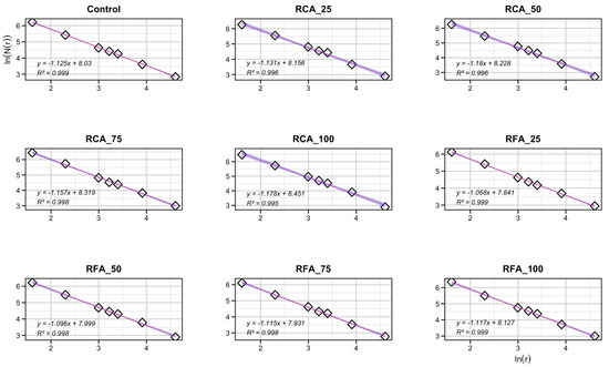 The box-counting method—a cornerstone of fractal analysis—partitions digital images into grids of decreasing size (ε) and counts the number of boxes (N(ε)) containing crack pixels [21,22]. The fractal dimension D is derived from the slope of log(N(ε)) vs. log(1/ε), with higher D values indicating greater spatial complexity [23]. While computationally intensive, this technique offers a practical and easy way to capture crack features. To model the three-dimensional interplay between RCA/RFA dosage, applied load, and fractal dimension, this study employs polynomial trend surface fitting. Second-order (quadratic) and third-order (cubic) polynomials capture nonlinearities absent in linear regression, enabling the isolation of main effects (RCA/RFA dosage and load) and interaction terms.