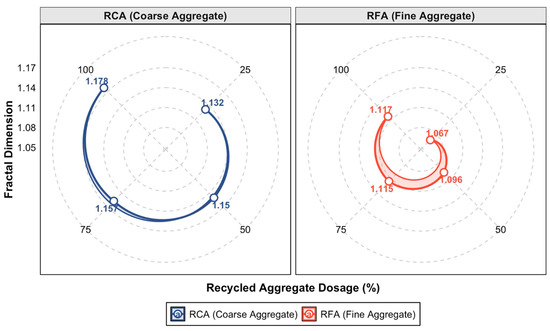 The underlying mechanisms behind these observed relationships are closely related to the properties of recycled coarse aggregate. Recycled coarse aggregate typically has different physical and mechanical characteristics compared to natural aggregate, such as higher porosity, lower density, and weaker interfacial transition zones between the aggregate and the cement paste [10,25,26]. These factors reduce the overall stiffness and strength of the concrete beam. As the dosage of recycled coarse aggregate increases, the beam becomes more susceptible to deformation under load, which is reflected in the increasing deflection with the development of cracks (higher fractal dimension). Additionally, the nonlinear relationship between the fractal dimension and deflection can be explained by the nonlinear decrease in the beam’s load-carrying capacity as cracks develop and coalesce. The dosage-dependent behavior is due to the cumulative effect of the recycled coarse aggregate’s properties on the beam’s performance, with different dosages leading to varying degrees of influence on the deflection–crack fractal dimension relationship.