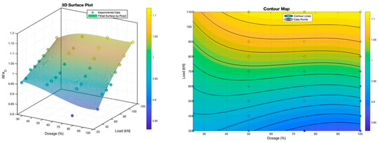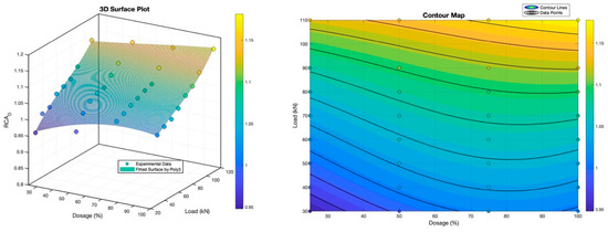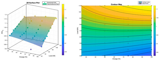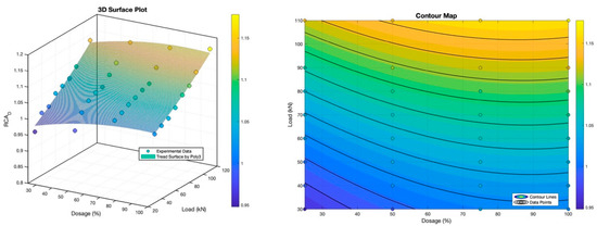 The four charts collectively illustrate the intricate relationships between the dosage of RFA and RCA, applied load, and the fractal dimension (D) of crack propagation in concrete beams, employing both second-order and third-order polynomial trend surface fitting. These figures are used to assess the implications of recycled aggregate-induced crack complexity variations. Figure 8, depicting a 3D surface plot and contour map for RFA_D, reveals a fitted formula indicating a negative quadratic influence of dosage and a positive linear effect of load on RFA_D, suggesting that while an increased RFA dosage initially reduces crack complexity, higher loads amplify it. The R-squared value of 0.9201 underscores the model’s strong explanatory power. Figure 9, focusing on RFA dosage variation under incremental loading, corroborates the negative dosage effect and positive load impact, with an interaction term highlighting that the dosage’s influence on RFA_D becomes more pronounced with rising load, as evidenced by an R-squared of 0.9353. Shifting focus to RCA, Figure 10, utilizing a second-order polynomial, demonstrates positive linear relationships between RCA dosage, load, and RCA_D, implying that a higher RCA content and increased load both elevate crack complexity. The negligible interaction term suggests a minimal combined effect, yet the model explains 96.53% of RCA_D variance. Figure 11, employing a third-order polynomial for RCA dosage analysis, reveals a more nuanced relationship: while RCA dosage and load positively influence RCA_D linearly, negative quadratic and cubic terms indicate a potential plateau or reversal in crack complexity at extremely high dosages or loads. The exceptional R-squared value of 0.9779 attests to the model’s remarkable fit.