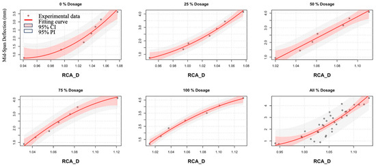 Figure 13 presents a set of graphs and comprehensively depicts the relationship between the fractal dimension of cracks (RFA_D) and the mid-span deflection of beams under varying dosages of recycled fine aggregate (RFA), encompassing 0%, 25%, 50%, 75%, 100%, and an “All Dosages” scenario. Each graph is equipped with data points (gray dots), a quadratic fit curve (red line), and 95% confidence intervals (shaded red area), providing a detailed and nuanced view of this relationship.