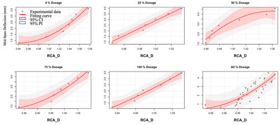 Figure 12 presents a series of graphs that show the correlation between the fractal dimension of cracks (RCA_D) and the mid-span deflection of concrete beams incorporating varying proportions of recycled coarse aggregate (RCA). The different proportions examined are 0%, 25%, 50%, 75%, and 100%, along with a comprehensive “All Dosages” category. Each graph is composed of data points (depicted as gray dots), a quadratic regression curve (shown in red), and 95% confidence intervals (represented by the red-shaded area).