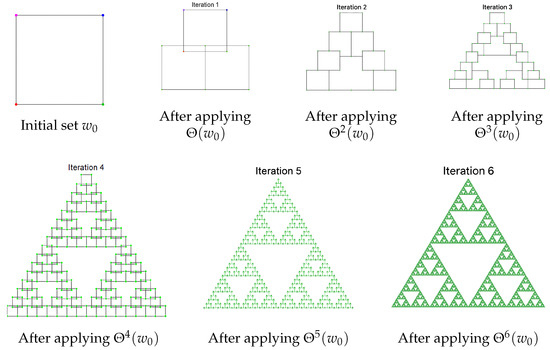 The step-by-step construction of the fractal set under the iteration of is illustrated in Figure 3.