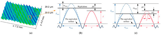 The height δ of any asperity on the surface is determined by the contact area a through the three-dimensional W-M function, as demonstrated in Figure 1c. Combined with Equation (1), the height δ can be simplified as follows [32,33]