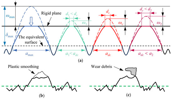 when λ = 3 is the shape factor of the three-dimensional contour. The σj defines the shear strength of the adhesion, G0 denotes the shear modulus, and Δw indicates the crack surface energy per unit area [17]. As demonstrated in Figure 2, the asperities undergo wear and produce debris when the a exceeds the critical area scale adc. On the contrary, the asperities remain in the plastic smoothing stage. Considering the influence of material properties, Equations (9) and (12) are combined to solve the critical area scale adc further.
