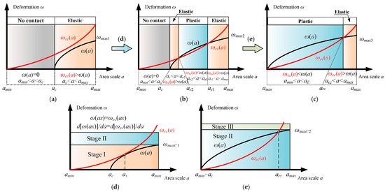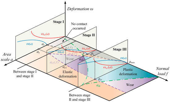 Increasing normal contact load elevates ωmax, as illustrated in Figure 3, establishing three characteristic contact stages within the contact interface. In stage I, the critical deformation curve ωec(a) consistently remains above the actual deformation curve ω(a) of the asperities, indicating that all contacting asperities undergo elastic deformation in this stage.
