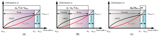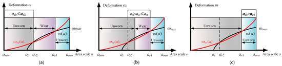 Figure 4 illustrates the wear behavior of asperities in stage II. Stage II can be divided into three distinct situations according to the intersections of ae2 and ae1. Asperities are classified as the first stage when the critical area scale adc satisfies adc < ae2. In this case, the asperities produce wear debris when ae2 < a < ae1. The asperities do not experience wear in other regions, as the two conditions necessary for the generation of wear debris are not satisfied. Meanwhile, asperities are classified as the second stage when the critical area scale adc satisfies ae2 < adc <ae1. The wear debris is generated when adc < a < ae1. In other regions, wear does not take place. During the third stage, no wear occurs in the entire contact area when adc > ae1.