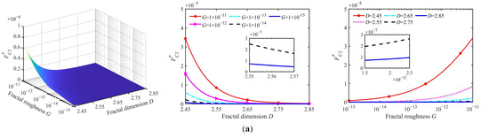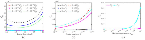 Figure 7b demonstrates the parametric relationship between the critical contact load FC2* and surface fractal characteristics. The relationship between surface fractal parameters and FC2* exhibits nonlinear complexity. The critical contact load FC2* scales monotonically with the G under fixed D. The critical contact load FC2* exhibits a convex non-monotonic relationship with D under constant G, initially decreasing before transitioning to an increasing regime. Additionally, FC2* increases with D under G = 1× 10−15 m, indicating a positive correlation between D and the critical contact load.