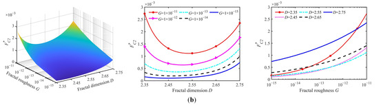 The critical contact loads FC1* and FC2* are obtained with the surface fractal parameters obtained under the conditions of amax = 1 × 10−5 m2 and amin = 1 × 10−15 m2, as demonstrated in Figure 7a,b. Figure 7a shows the critical contact load FC1* variation with the surface fractal parameters. For a constant fractal roughness G, the critical contact load FC1* exhibits a decreasing trend with increasing fractal dimension D. Conversely, FC1* increases as the fractal roughness G increases for a constant fractal dimension D. Generally, a higher D and a lower G indicate a smoother surface for three-dimensional fractal surfaces. Figure 7a reveals that the critical contact load FC1* attains its maximum value of approximately 3.5 × 10−5 under fractal parameter conditions D = 2.5 and G = 1 × 10−11 m, representing the maximum transitional load between stage I and stage II contact regimes. Increasing D and decreasing G reduce the critical contact load FC1*, lowering the load threshold required to transition to stage II.