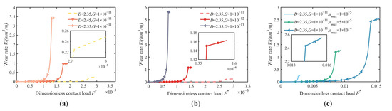 Figure 7 directly demonstrates that rougher fractal surfaces necessitate higher critical contact loads FC1*. The fractal surface is relatively rough, so the area of wear to zero is longer when D is 2.35 in Figure 10a. The surface becomes smoother as D increases, requiring a smaller critical contact load FC1*, so the area with wear of zero is shorter. Furthermore, the figure illustrates that alterations in the F*-V curve’s slope reflect the shift between various contact stages. The F*-V curve slope exhibits a pronounced increase with rising fractal dimension D during stage II, indicating a faster intensification of wear rate as contact loads grow.