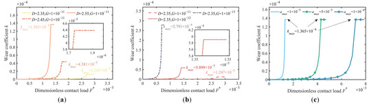 As illustrated in Figure 11b, variation curves of the wear coefficient under different fractal roughness G conditions are depicted. The figure shows that the maximum wear coefficient increases as G decreases. Specifically, when the fractal roughness G is 1 × 10−13 m, the maximum wear coefficient is 2.791 × 10−4. Figure 11c demonstrates the wear coefficient variation under different maximum contact area amax conditions. Notably, the maximum wear coefficient kmax remains consistent at 1.365 × 10−4 across the three curves as the amax increases. This is because amax essentially reflects the number of contacting asperities and only affects the critical contact load FC2* required for the transition from stage II to stage III. As amax increases, FC2* also increases. Thus, amax does not influence the variation of the wear coefficient based on Equations (37) and (38).