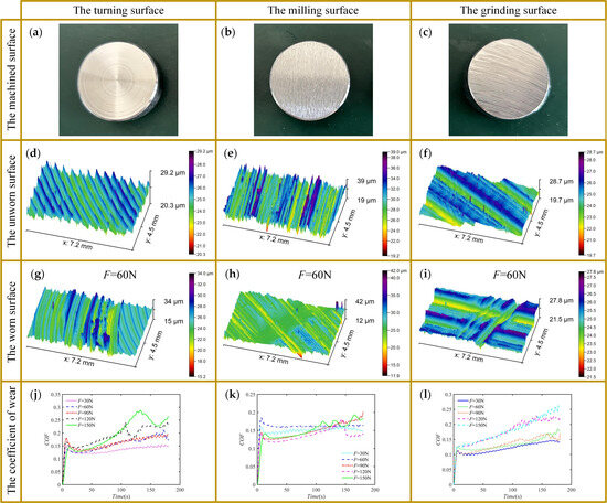 Figure 12 depicts the alterations in the three-dimensional morphology and friction coefficient of the turning, grinding, and milling surfaces before and after wear under a normal load of F = 60 N. The averaged friction coefficients measured 0.157 for the turning surface, 0.151 for the grinding surface, and 0.134 for the milling surface. Friction coefficients across machined surfaces exhibited a corresponding increase with elevating normal load magnitudes. This increase arose from the initial wear stage, inducing a progressive friction coefficient elevation with increasing normal load.