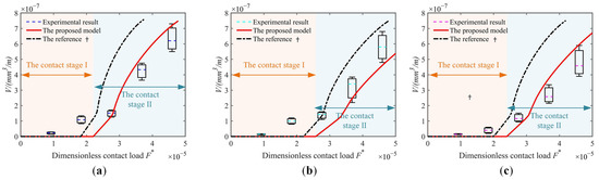 Three wear tests were conducted on surfaces with the same machining method when the normal load remained constant. The experimental results were averaged to reduce the installation error and equipment error during the experiment. Figure 13 presents a comparative analysis between experimental measurements of dimensionless contact load F* and volumetric wear rate V for distinct surface types and the corresponding computational results derived from the proposed model. With the increase in contact load, two distinct wear stages were observed. The wear rate remained minimal under relatively low contact load conditions. Conversely, the wear rate gradually increased with higher contact loads. This wear phenomenon has been previously documented in the academic literature [40]. The model-predicted critical contact force corresponded precisely to the inflection point on the dimensionless contact load and wear rate curve observed in experimental measurements. This alignment represents the “transition” from minor wear to severe wear, further validating the accuracy of the prediction model. Notably, the curve for wear rate versus contact load in stage III did not exhibit a linear increase with increasing contact load. This absence of a linear trend was attributed to the relatively low loads applied in the experiments.