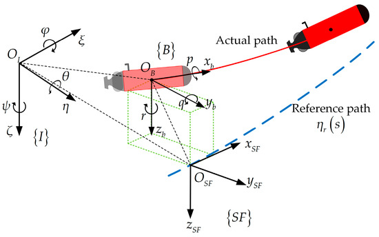 This section derives the path-following error model of an underactuated AUV in three-dimensional space. First, the coordinate system and related symbols used are defined, followed by the kinematic and dynamic models of the AUV. Based on this, the mathematical expression of the three-dimensional path-following error is given.