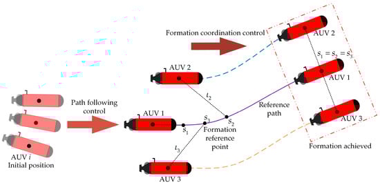 - Formation cooperative control strategy: For multi-AUV formation tasks, a cooperative control strategy based on path parameter negotiation is designed. This method assigns each AUV an independent formation reference point and achieves cooperative consistency through the exchange of path parameters rather than state information, reducing communication requirements and improving the strategy’s adaptability in bandwidth-constrained underwater environments.
