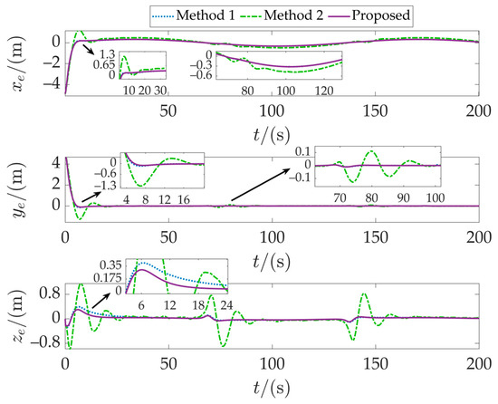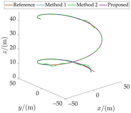 The tracking results for Case 1 are depicted in Figure 4. Under constant ocean current conditions, the three control methods enable the AUVs to converge and navigate along the desired path. However, they differ in tracking performance. Method 2 shows particularly significant fluctuations in position deviation. Figure 5 compares the position tracking errors of the three methods. Method 2 exhibits substantial error fluctuations in both the initial and later stages. Its position error is considerably larger than that of Method 1 and our proposed method. Although Method 1 shows smaller errors, minor discrepancies still exist compared to our proposed method. Speed comparison analysis, presented in Figure 6, further highlights the superiority of our method. Our method responds more swiftly, reaches the desired speed, and maintains good stability. In contrast, both Method 1 and Method 2 display unstable speed fluctuations. Their oscillations are more pronounced during the accelerated disturbance phase after 100 s.