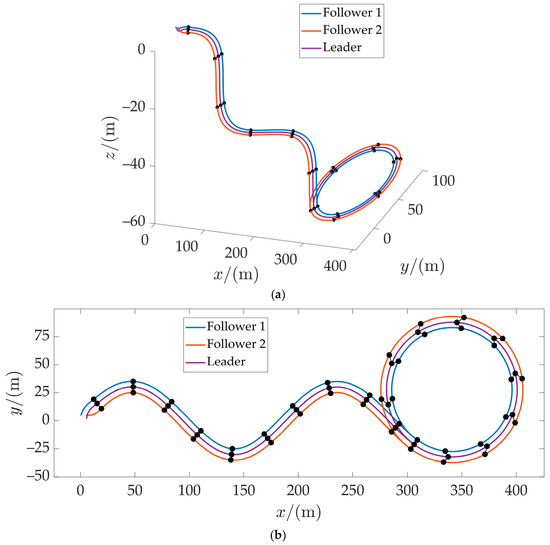 Formation-following situation. (a) Three-dimensional following situation (b) x-y plane projection following situation.