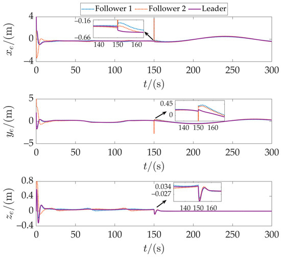 Figure 9 illustrates the formation movement paths of three AUVs, with several positions of the AUVs marked at the same time. It can be seen that the formation remains stable during both the straight-line and triangular formation stages. The designed controller ensures that the AUVs quickly converge to the reference path and maintain the formation stably, unaffected by their initial positions. The tracking error results are shown in Figure 10. Followers 1 and 2 are initially far from their reference paths, resulting in tracking errors that are significantly greater than those of the leader at the beginning. When switching from a spatial S-curve to a circular constant depth path, the curvature discontinuity of the desired path causes a temporary increase in the tracking error. Thanks to the path-following controller, the errors of all AUVs converge quickly and eventually stabilize at the same level.
